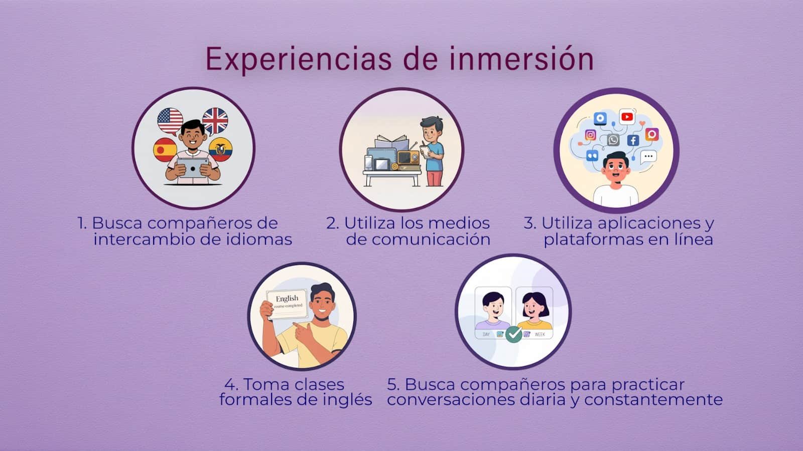 Vivir en un lugar donde se habla el idioma obliga a practicar a diario. Esto puede significar mudarse a un nuevo país, quedarse con una familia anfitriona, o crear un ambiente inmersivo en casa rodeándote del idioma a través de medios de comunicación, etiquetas en objetos domésticos, y configurando tus dispositivos en el idioma meta.